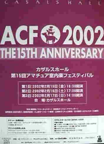 名古屋に転勤した<コンセール神戸>のコンマスが、第14回のACFを見に来てくれました。第8回に出演したときの感触が甦ったのか、話がとんとんと進み、今度はコンマスも含めてピアノ四重奏曲で応募しようということになりました。しかし三つの問題がありました。一つはビオラをどうするのかということです。この問題はすぐにクリア出来ました。タリヘーレ三重奏団のバイオリニストが「僕はハ音記号も読めるよ」と生意気なことをちょっと言ったので、すかさず、それじゃビオラを弾いて見ろ、ということになりました。もう一つの問題は、練習です。チェロ、ピアノ、ビオラは親子で、神戸在住。コンマスは結婚して名古屋在住。結局、名古屋から神戸にやってきて練習することになりました。三つ目の問題は、頻繁に名古屋から神戸にコンマスだけが来ると、コンマスの奥さんに申し訳ないということでした。これも簡単にクリアしました。というのは、彼女にフメクリストとしての役を演じてもらうことにしたため、二人で名古屋から来てもらうことになったからです。