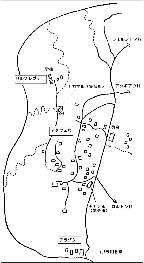 この地図は、1982年当時のラブルタマータ村。200人程の村である。北部ラガで最も大きなナカマル(集会所)がアタフェウ地区にあったが、台風で倒壊し、下の写真にあるように、臨時のナカマルが、やはりアタフェウ地区に設けられている。現在は、補助金を得て、コンクリート製のナカマルが完成したということである。