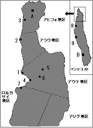 左地図のAは北部ラガ地区のタリ空港のあるところ、タリ空港が出来るまではロノロレ空港(B)しかなく、北部ラガに行くためには、ロノロレからトラックで9のメルシシ村まで行き、そこから船外機付ボートで8のバトナプニ村まで、ボートを乗り換えて北部ラガへという方法を取っていた。