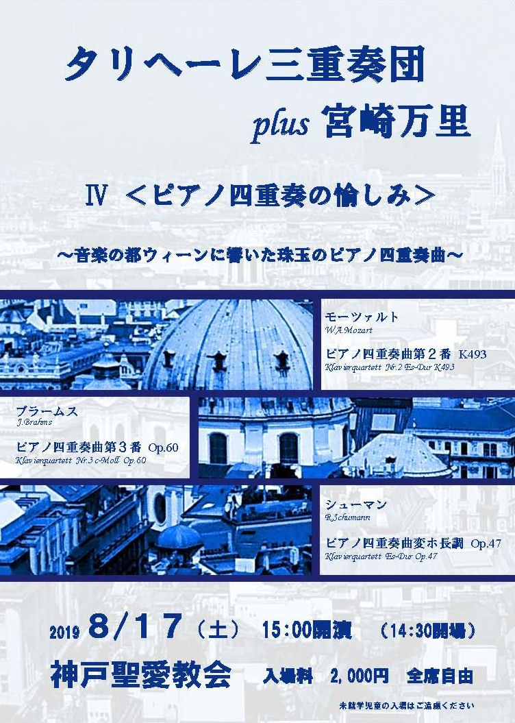 今回で、「タリヘーレ三重奏団+宮崎万里 演奏会」は4度目となりますが、昨年東京で行った演奏会で演奏したブラームスのピアノ四重奏曲第3番とシューマンのピアノ四重奏曲に加え、モーツァルトのピアノ四重奏曲第2番を演奏しました。ピアノ四重奏という演奏形態がまだ知られていなかったウィーンで、モーツァルトは初めてこの形態の曲を書いたのですが、ピアノ協奏曲の小型版を想定していたようで、第1番は、ピアノが独奏楽器のように活躍する三楽章形式の小型協奏曲のような曲だといわれいます。しかし今回演奏した2番は、三楽章形式ではありますが、ピアノ独奏の色彩は薄れより室内楽的になっていると評されています。後のピアノ四重奏という室内楽を確立したこの曲を最初に演奏し、続けてブラームスを演奏しました。そして休憩を挟んで、シューマンの四重奏曲で締めくくりました。それぞれ演奏会のトリを飾るにふさわしい大曲3曲を演奏するということで、アンコール用の曲を準備していませんでしたが、拍手をいただいたため、シューマンのピアノ四重奏曲から第3楽章を再度演奏することにしました。この楽章は、チェロ・ソロから始まるのですが、演奏の初めにチェロのピンを固定しているピン止めがガクッと動いてしまい、ピンは譜面台の足とピン止めの間でかろうじて不安定に止まっている状態になってしまいました。その結果、いろいろとミスも出てしまって、お聴き苦しい点があったと思います。