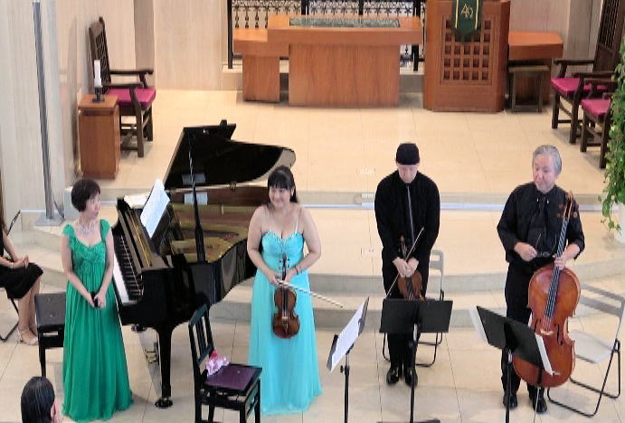 今回は、新神戸にある神戸聖愛教会で演奏しました。たくさんの演奏会が行われている神戸では有名な教会です。1階で180席ほどありますが、ピアノ四重奏という演奏形態のため、1階席の一番前の10席は取り外していただきました。ですので、結局170席となったわけですが、今回は、150名ほどの方々においでいただいたため、1階席はほぼ満席の状態になりました。ありがとうございました。